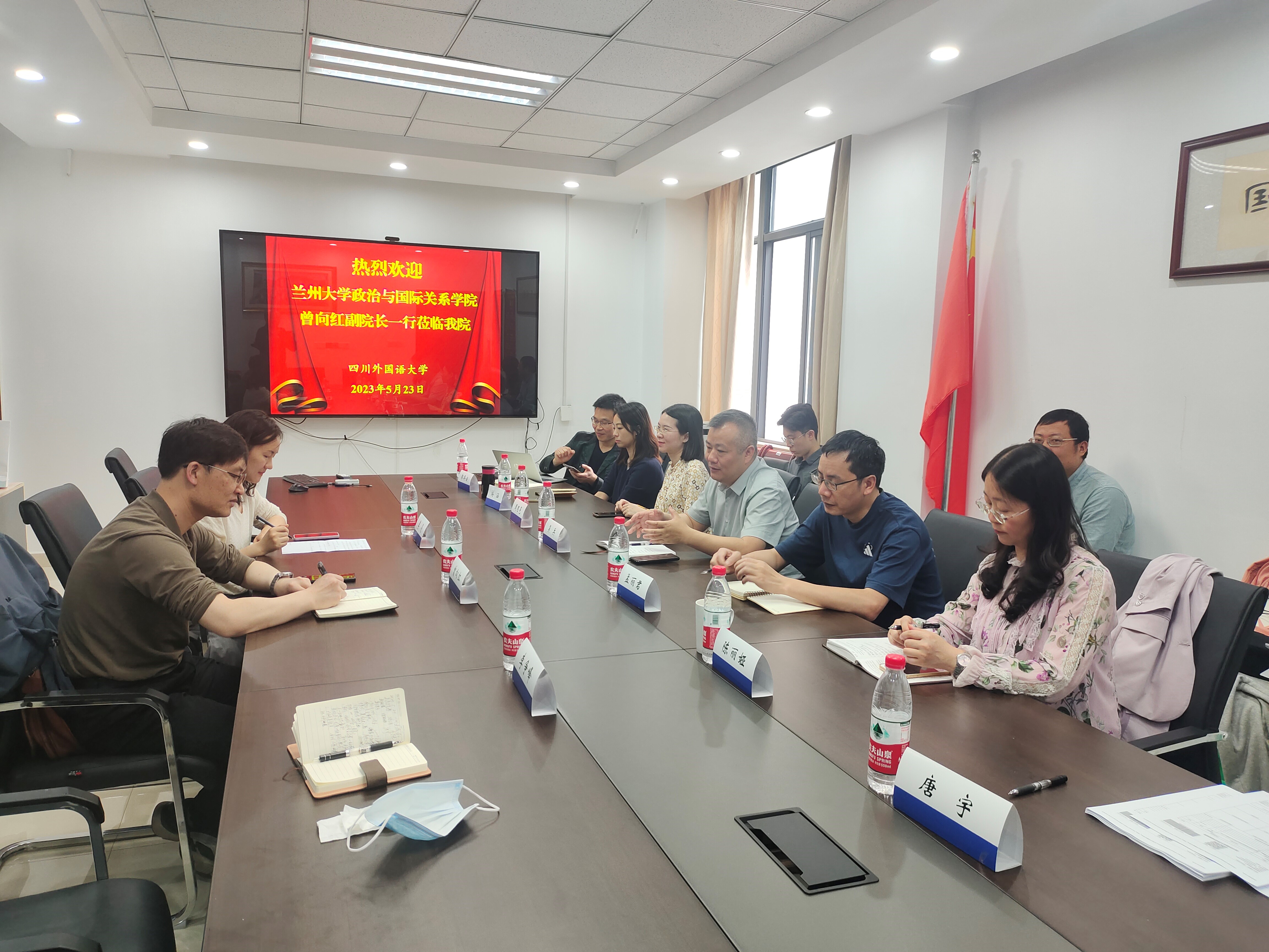 5月23日,曾向红教授一行拜访四川外国语大学国际关系学院,与副院长吴兵教授、席桂桂副教授、周思邑副教授、郭兵云副教授、游涵副教授、唐宇博士和余雅洁博士等多位教师举行座谈。吴兵教授介绍了四川外国语大学自1982年成立对外汉语系至2009年成立国际关系学院的发展历程,以及国际关系学院在学科设置、人才培养和有组织科研等方面的情况。他还重点介绍了2003年四川外国语大学与英国埃塞克斯大学开设的3+1“国际组织人才”实验班,分享了语言和学科双管齐下的培养模式及引入第三方机构为实验班学生提供实习就业平台的成功经验。陈丽娅老师则介绍了本院举办模拟联合国、模拟外交官等活动并在国家级外交外事类专业赛事中获奖的实践教学成果。随后,双方就本科生的人才培养、科学研究、学科建设等问题进行交流互动。曾向红教授表示,在国家大力建设陆海新通道之际,西南和西北的高校应该加强联动,希望日后兰州大学政治与国际关系学院与四川外国语大学国际关系学院能在举办学术会议、联合科研等方面加大合作力度。